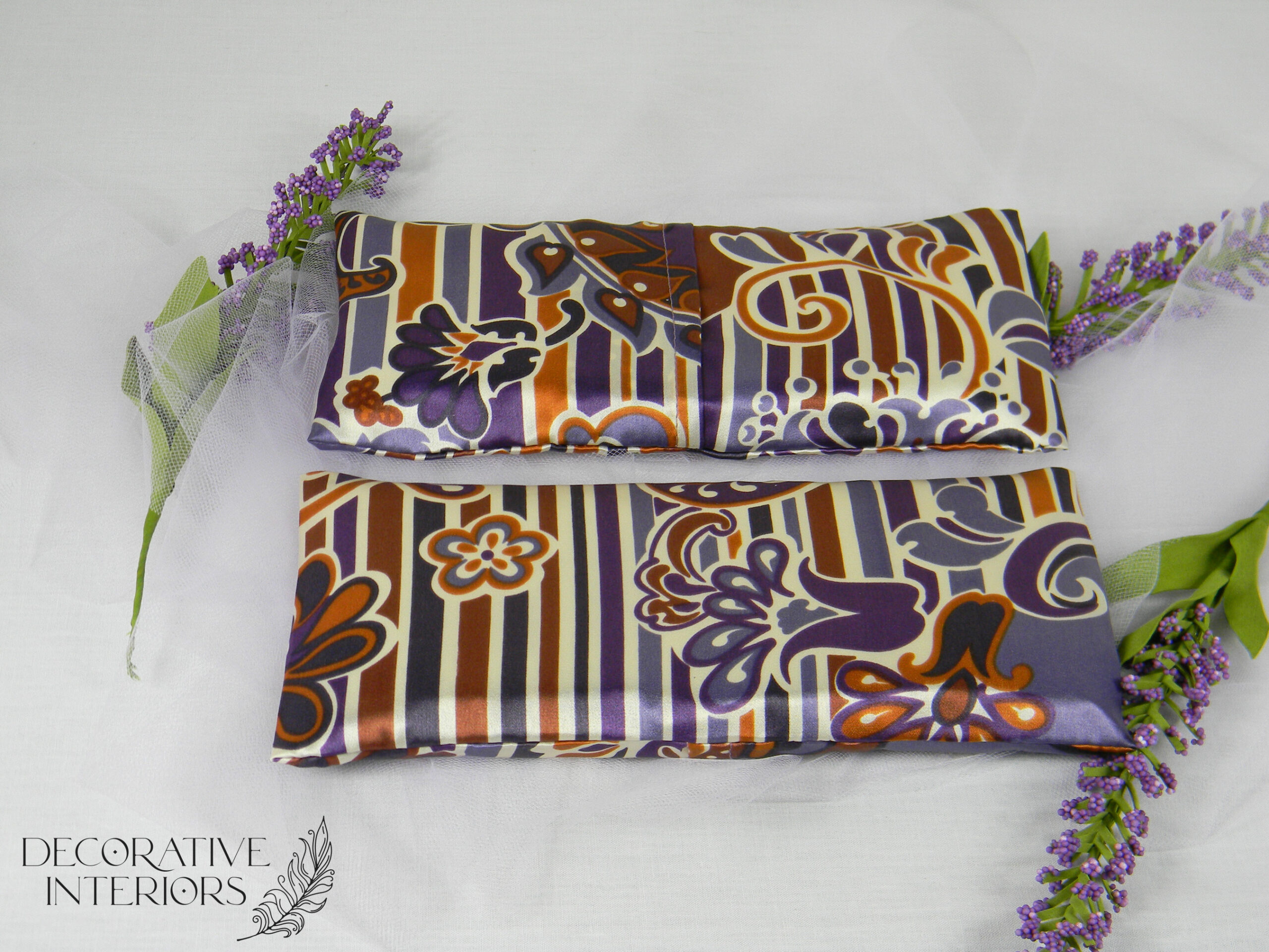 Each custom lavender eye pillow is hand-sewn with 100% imported printed silk fabrics. Each one of these custom eye pillows will send you into a deep relaxation. Every eye pillow is filled with a separate removable cloth insert, filled with a scoop of imported organic French lavender and flax seeds.